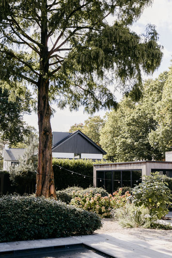 Er is een overkapping met loungeset, perfect om te relaxen, en een zwembad met vlonder en moderne buitendouche voor de ultieme ontspanning. Grote stapstenen verbinden de terrassen, waardoor de tuin een mooie flow krijgt. Een fijne plek om te genieten, het hele jaar door.