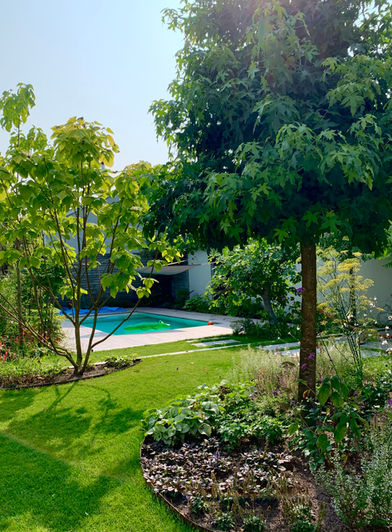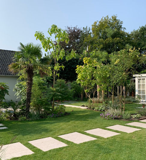 Deze ruime binnentuin in het rustige plaatsje De Moer is een echte oase van rust en biedt een heerlijk vakantiegevoel. Verschillende terrassen worden met organische borders van weelderige beplanting met mooie bladstructuren met elkaar verbonden. Dit zorgt voor verrassende hoekjes en maakt de tuin spannend en knus. Er is een zwembad, sauna en buitendouche voor ultieme ontspanning, en een groot grasveld voor de kinderen om lekker te spelen. De wens van de bewoners om palmbomen toe te voegen, maakt de tropische sfeer helemaal af. Kortom, een tuin waar je echt even helemaal tot rust komt!